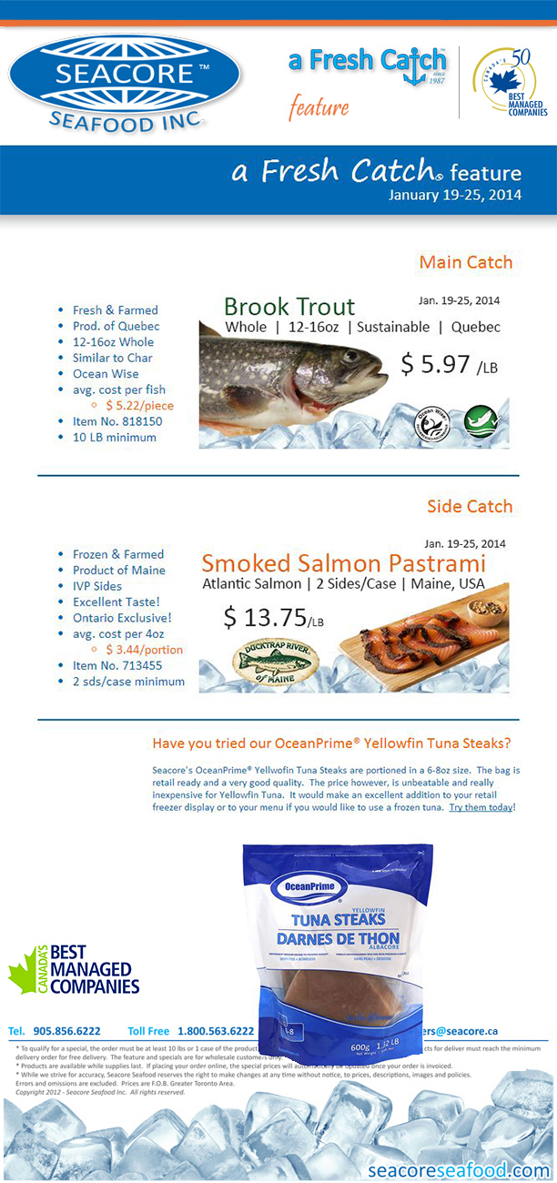 Fresh Brook Trout from Quebec Frozen Ducktrap Smoked Salmon Pastrami OceanPrime Yellowfin Tuna Steaks