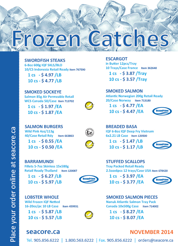 Swordfish Steaks, Smoked Salmon, Lobsters, Escargot, Smoked Sockeye Salmon, Smoked Salmon Trimmings, Barramundi, Salmon Burgers, Breaded Basa, Squid Rings, Stuffed Scallops