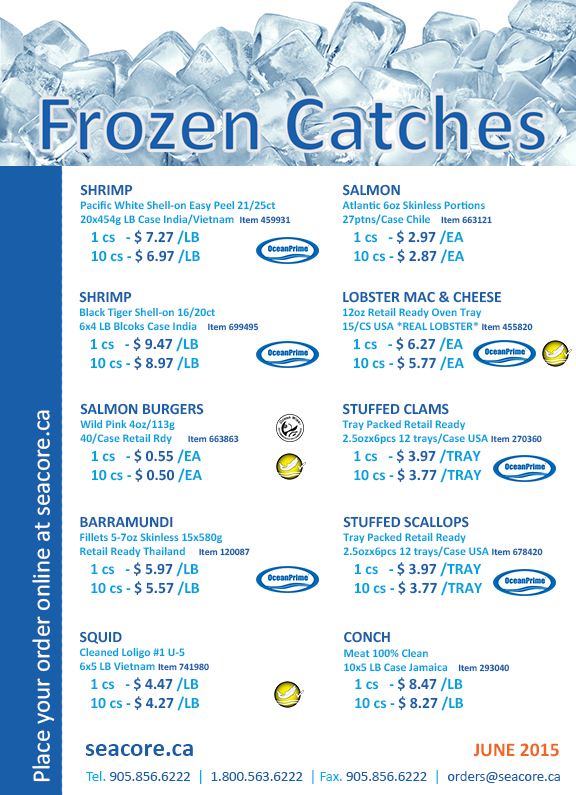frozen catches, weekly features, monthly specials, frozen fish, & frozen seafood, deals. Mackerel, Striped Bass Fillet, Lobster, Lobster Mac & Cheese, Shrimp Black Tiger Smoked Salmon, Conch, Squid, Loligo Squid, Salmon Burgers, Stuffed Scallops, Stuffed Clams, Barramundi