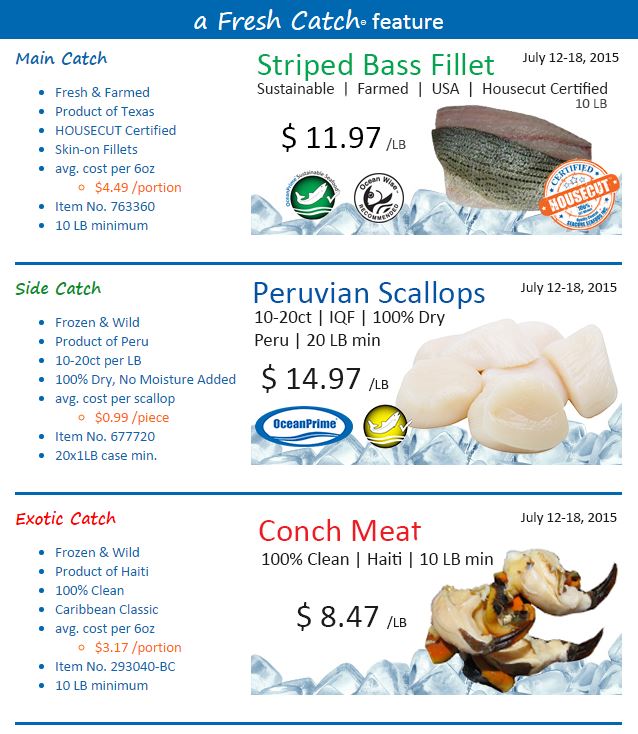 Striped Bass Fillets, Striped Bass, Hybrid Bass, Peru Scallops, Peruvian Scallops, Sea Scallops, Conch Meat