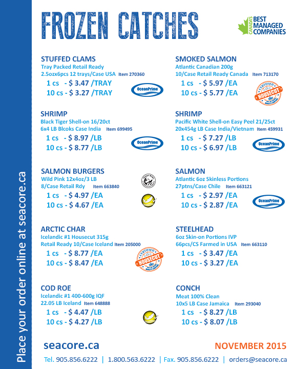Stuffed Clams, Smoked Salmon, Smoked Atlantic Salmon, Salmon Burgers, Salmon Portions, Arctic Char, Shrimp, Steelhead, Cod Roe, Conch