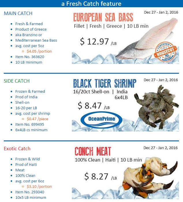 Fresh Euro Sea Bass Fillets, Frozen Black Tiger Shrimp, Frozen Conch Meat