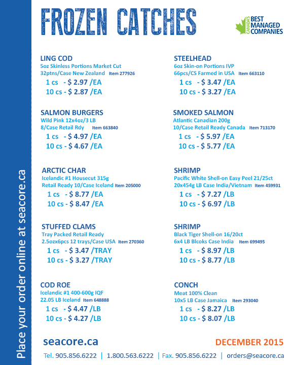 Ling Cod, Pacific Cod, Steelhead Salmon, Salmon Burgers, Smoked Salmon, Arctic Char, Shrimp White, Black Tiger Shrimp, Stuffed Clams, Cod Roe, Conch Meat