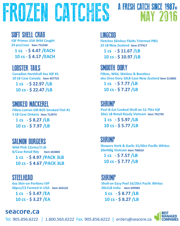 Seacore has some #1 quality Canadian Lobster Tails available for the month of May. Take advantage of this great price for these hardshell 4oz Lobster Tails that are wild caught on the east coast of Canada. These Lobster Tails are very nice and full with a great meat yield. Available in a 10 LB case, contact us today to try them out! Retail packaging options are also available.