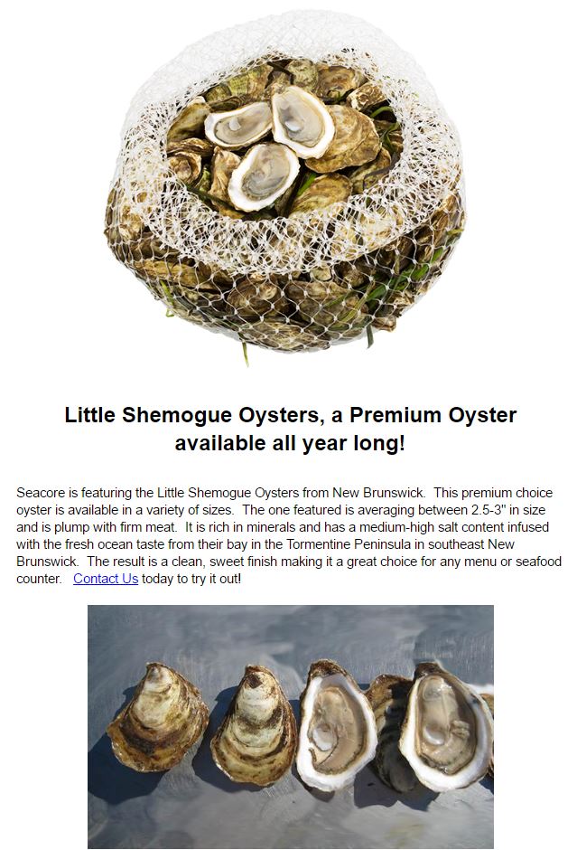 Ocean Perch Fillets, Redfish, Little Shemogue Oysters, Cooked Shrimp Tail-off, Salad Shrimp