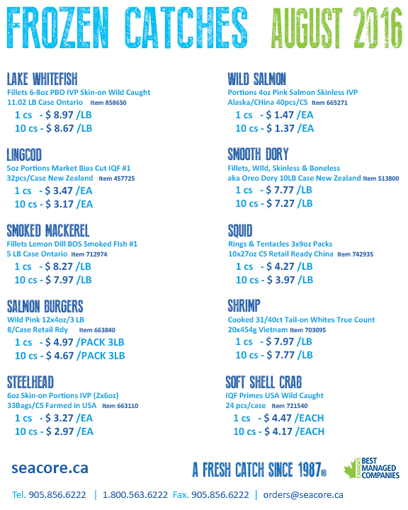 Wild Salmon, Pink Salmon, Lake Whitefish, Whitefish Fillets, Lingcod, Smoked Mackerel, Squid, Salmon Burgers, Shrimp, Steelhead Salmon, Steelhead Trout, Soft Shell Crabs, Blue Crabs