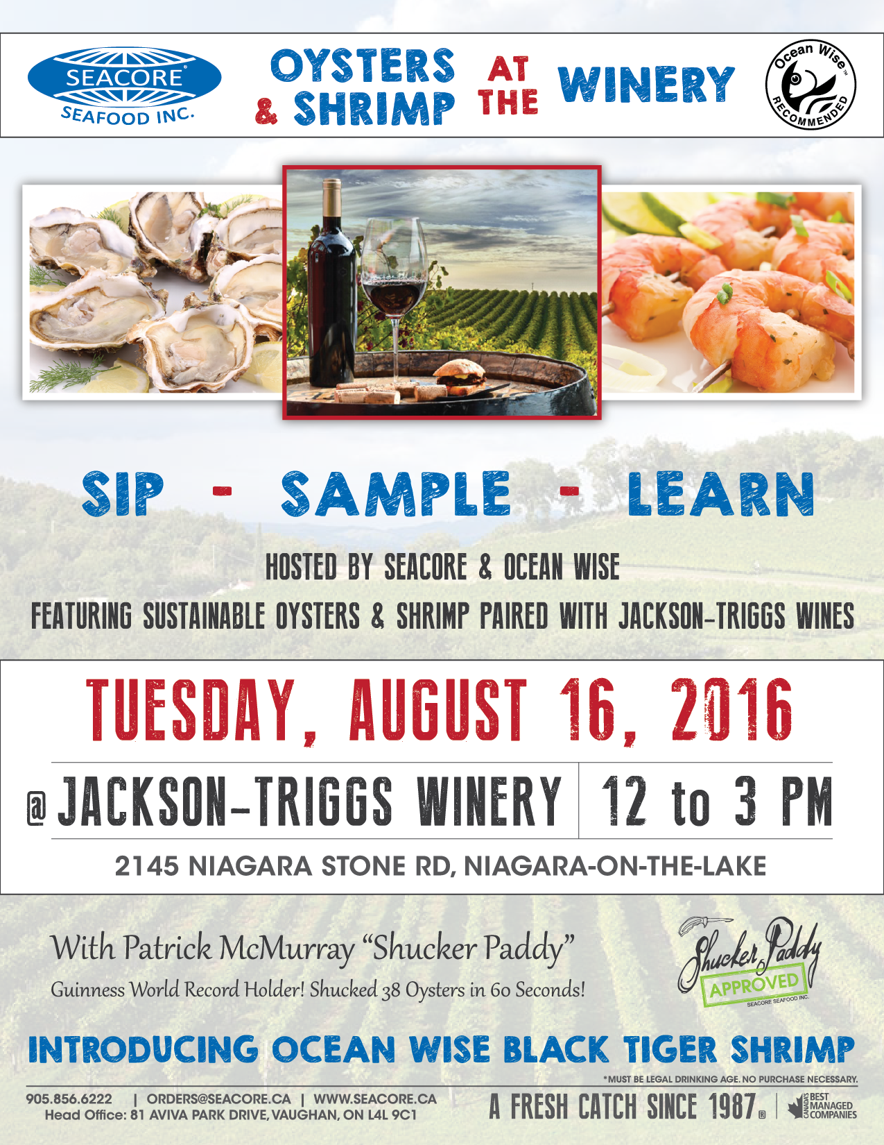 Seacore and Ocean Wise are hosting an afternoon event at the beautiful Jackson-Triggs Winery on August 16th from 12pm to 3pm. We will be featuring Ocean Wise recommended Oysters and Seacore's brand new OceanPrime Black Tiger Shrimp that are Ocean Wise Recommended as well. Come out to try some premium oysters and quality shrimp all paired with some local Niagara-on-the-Lake Wine from our friends at Jackson-Triggs. At the same time talk to the Ocean Wise representatives and learn how you can support sustainable seafood in your business. World Guinness Record Holder Patrick McMurray aka Shucker Paddy will be there along with many of Seacore's team members. Even if it's just to say hi,w e hope to see you there!