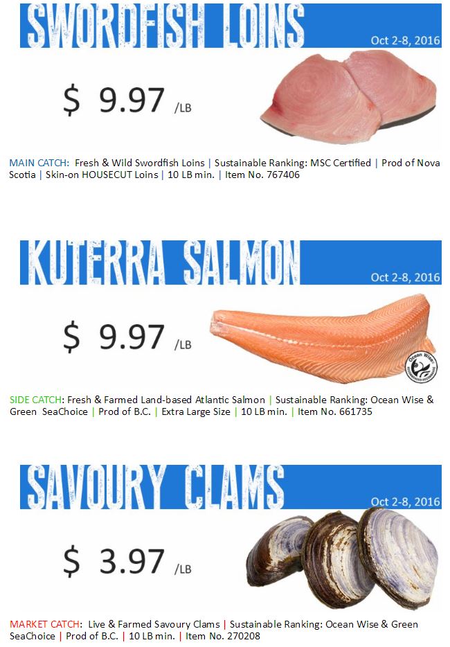 Swordfish Loins, Swordfish, MSC Swordfish, Kuterra Salmon, Land-based Salmon, Ocean Wise Atlantic Salmon, Savoury Clams, BC Clams