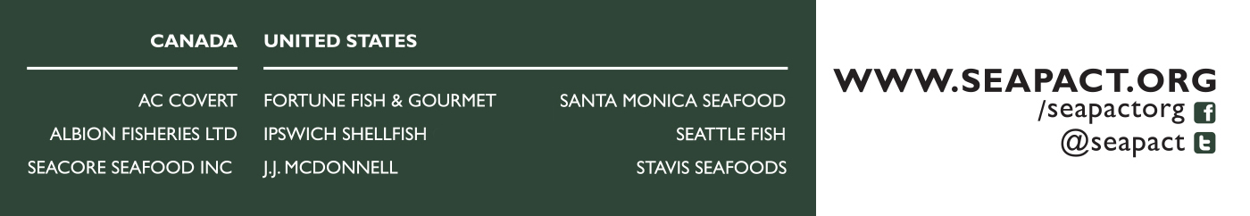 About Sea Pact: Albion Farms & Fisheries, Fortune Fish & Gourmet, Ipswich Shellfish Group, Santa Monica Seafood, Seacore Seafood and Seattle Fish Co., Stavis Seafood, JJ McDonnell, and A.C. Covert are the nine unified members of Sea Pact and share an active progressive approach to their seafood sustainability commitments. Sea Pact receives sustainability counsel from non- profit organizations FishWise, Sustainable Fisheries Partnership, and Ocean Outcomes. Sea Pact has non-profit organization 501(c)(3) status, administered through New Venture Funds.